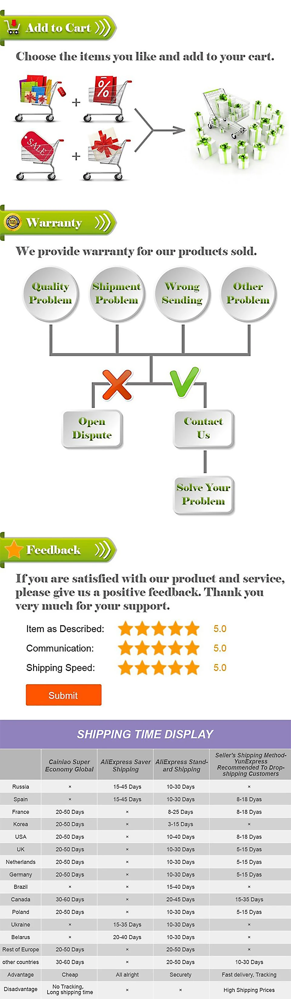 4. Se os produtos que você recebeu foram danificados ou estilos errados, não deixe nenhum feedback negativo primeiro, entre em contato via aliexpress nós, nós lidaremos com isso e encontraremos as melhores soluções, sua satisfação é nossa motivação para fazer melhor.